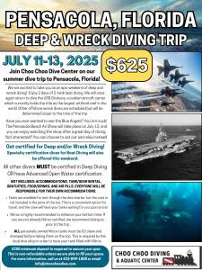 Join Choo Choo Dive Center on our summer dive trip to Pensacola, Florida! We are excited to take you on some epic dives to deep wrecks such as the USS Oriskany, a sunken aircraft carrier known as the largest artificial reef in the world! We also have other wreck dives planned, which will be revealed closer to the time of the trip.